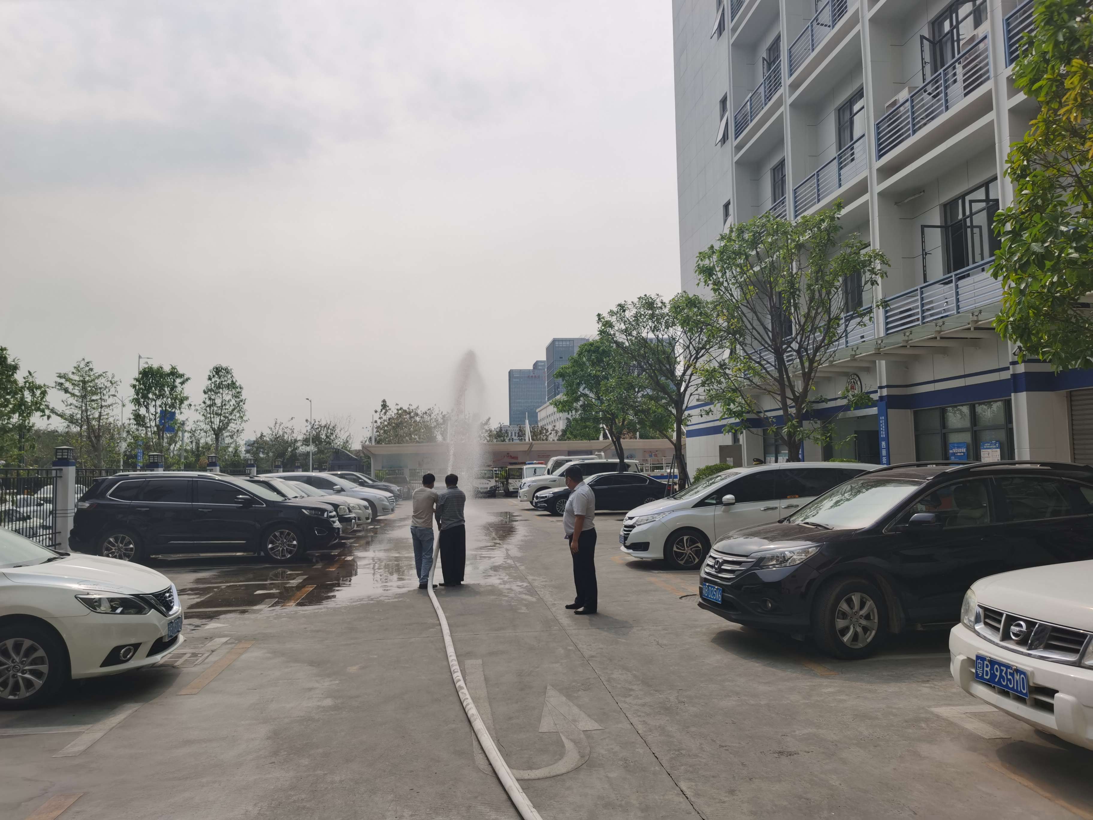 現場演練消防設施,管道通常,噴頭水柱灑滿地!